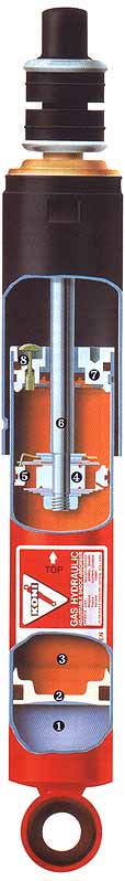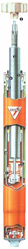 1.) Gasraum. Das Volumen ist größer als üblich, um hohe Betriebsdrücke bei Hochleistungsbetrieb zu vermeiden. 2.) Beweglicher Trennkolben. 3.) Ölraum. KONI verwendet ein Dämpferöl, das einen höheren Viskositäts-lndex als üblich hat. Dieses Spezialöl verringert die unerwünschte Erhitzung im Hochleistungsbetrieb. 4.) Arbeitskolben aus Sintermetall mit Federscheiben zur präzisen Steuerung des Öldurchflusses. 5.) Teflon-Führungsring vermindert die Reibung und garantiert lange Lebensdauer. 6.) Kolbenstange mit weit über dem Standard liegender Zugfestigkeit. 7.) KONI-Dichtungs und Führungssystem mit spezieller Teflon-Führung. 8.) Nachstellbolzen.